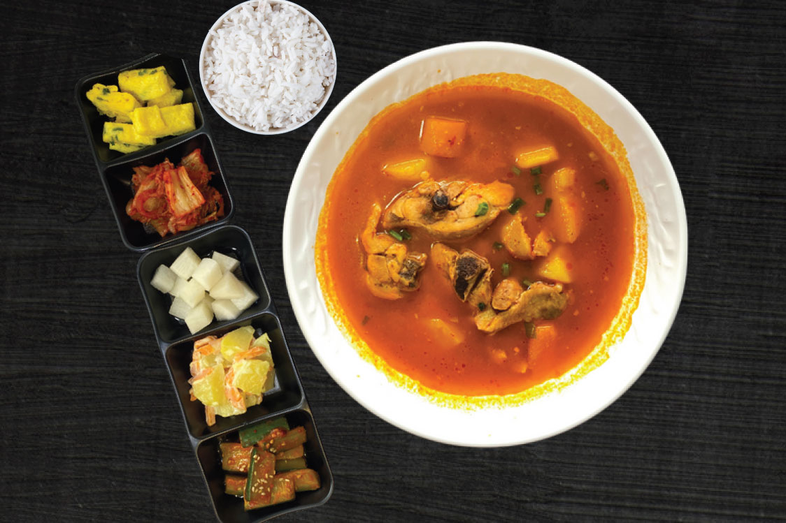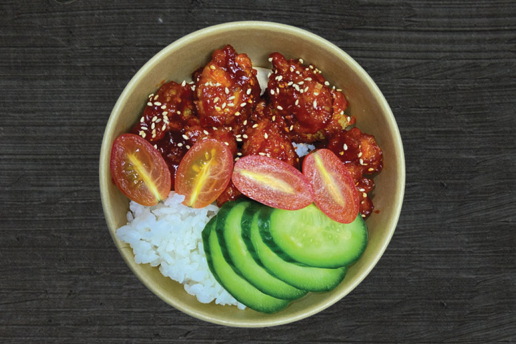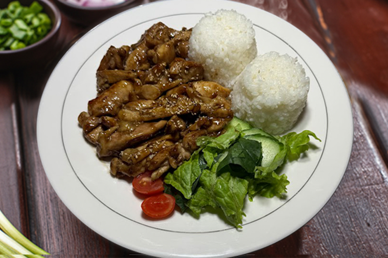 терияки чихэрлэг соус, тахиан мах, шарсан төмстэй