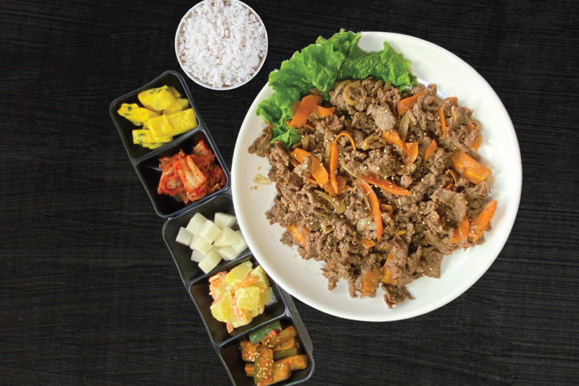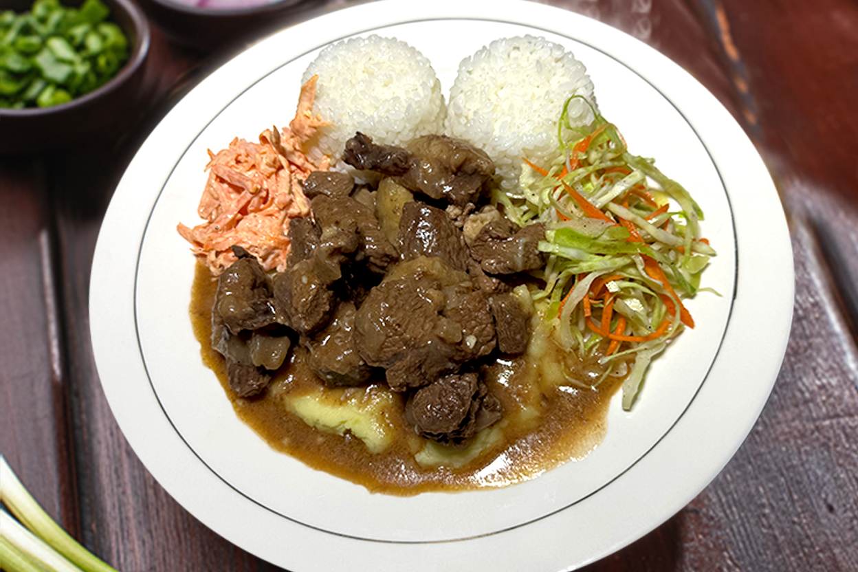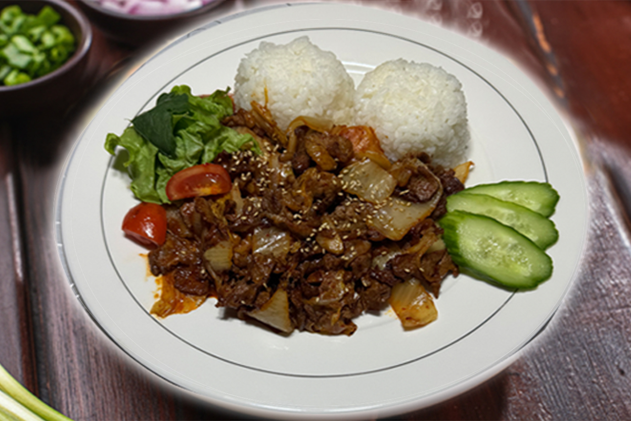 Үхрийн мах, нухсан төмс, будаа, луувангийн салат, байцааны салат, соус