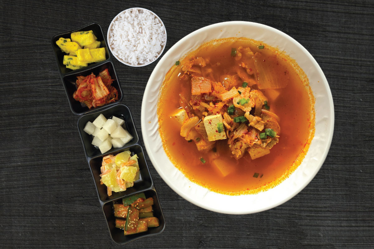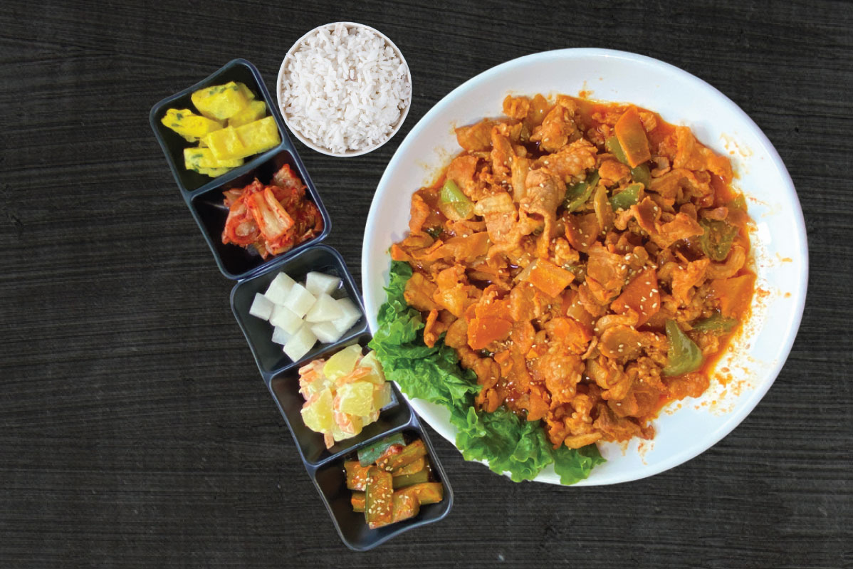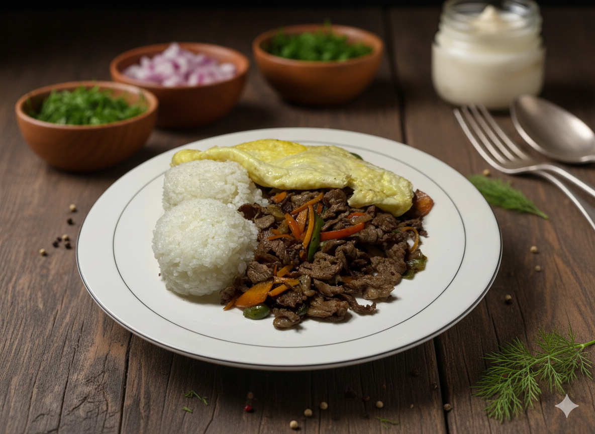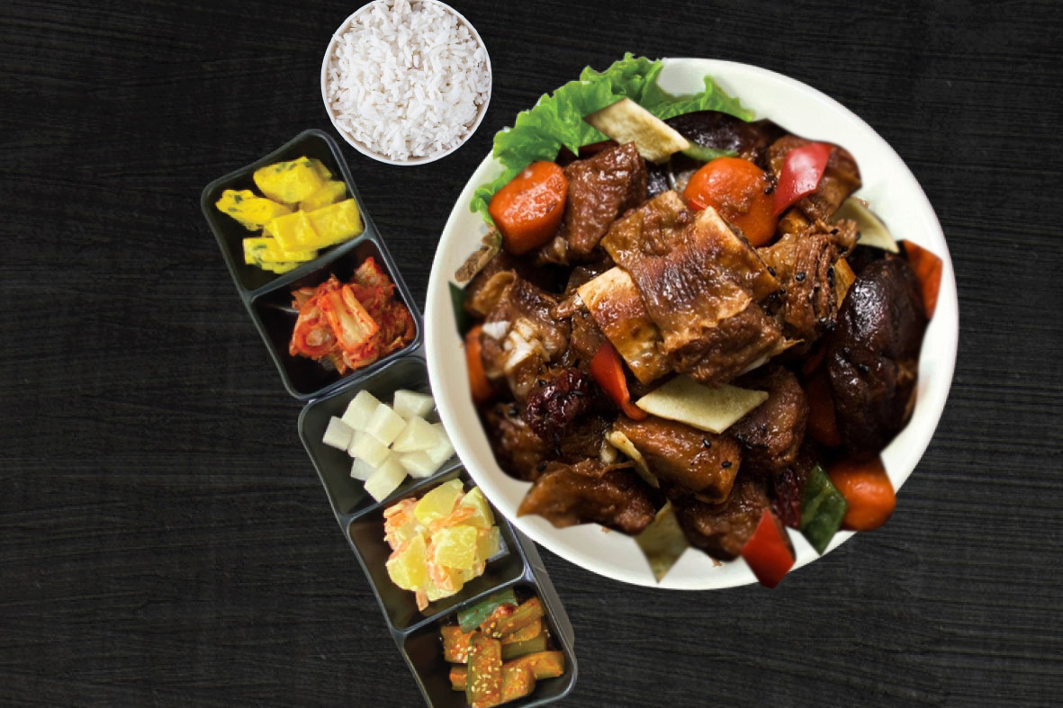 Үхрийн мах, нухсан төмс, будаа, луувангийн салат, байцааны салат, соус