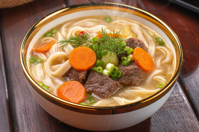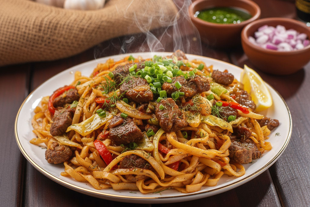 Үхрийн махтай, ногоон сонгино, хэрчсэн гурил, чинжүүтэй